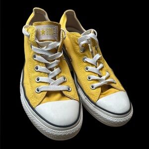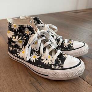 Black high-tops with white laces. Features classic Converse logo. Not platformed. Chuck 70 Canvas. Unisex. Size 6 men’s / Size 8 women’s