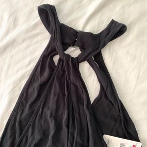 The tank buckles in the back on the neck. The front is open to reveal cleavage, the cut is low under the arms as well. This style would look cute with a bralette. I have not worn it.