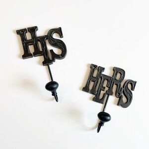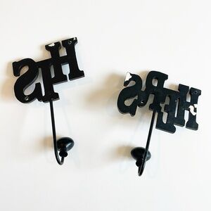 Add a touch of elegance to your home with these black His and Hers wall hooks. Perfect for organizing your space with style. Comes with matching hardware