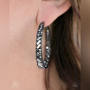 The front facing surface of a chunky gunmetal hoop is dipped in brilliantly sparkling hematite rhinestones while light-catching texture wraps around the back. The interior of the hoop features the opposite pattern, creating the illusion of a full hoop of blinding shimmer. Earring attaches to a standard post fitting. Hoop measures 1 3/4" in diameter.