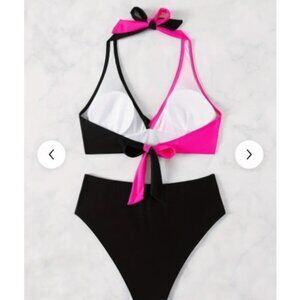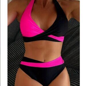 Black & Hot Pink Colorblock Halter Bikini Set Size Small | NWOT | MSRP $42