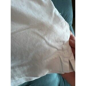 98 cotton 2 spandex -so has some stretch, good condition with 3 tiny pen tip marks in a cluster, see pictures, no other issues