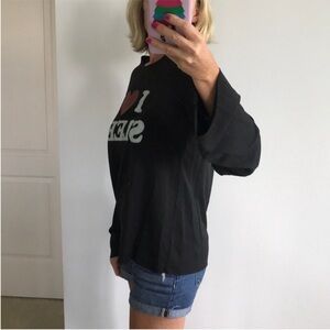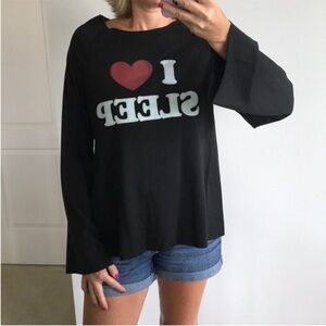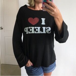 Black long sleeve shirt with 'I Love Sleep' graphic in red and white. Great for lounging or easy to throw on to run errands. Relaxed fit. Long sleeves. Raw edging. 85 polyester 13 rayon 2 spandex. I am modeling size Small. Fit is true to size. New boutique item.