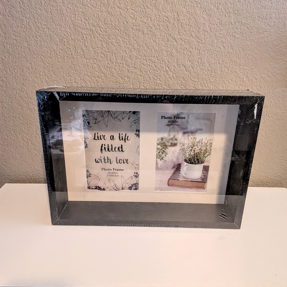 Elegant black photo frame perfect for showcasing your cherished memories. Adds a touch of sophistication to any room. It's hard to see but the photos are at the back of the frame. This frame is perfect for adding anything in front of the pictures that relate to the pictures.