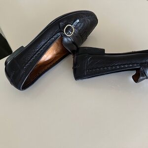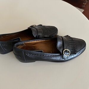 The shoes have black leather straps, fringe and gold buckles. They are trimmed with top stitching, cross stitch and herringbone details. There are no scuffs, abrasions or signs of wear.
