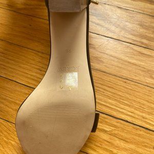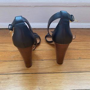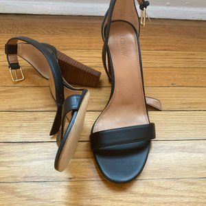 Black leather J. Crew ankle-strap heeled sandals with wooden heel. Size 9.5, but would fit best on a narrower foot or size 9. EUC.