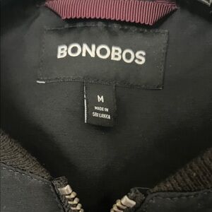 Classic black bomber jacket by Bonobos. Features a zip closure and ribbed cuffs.