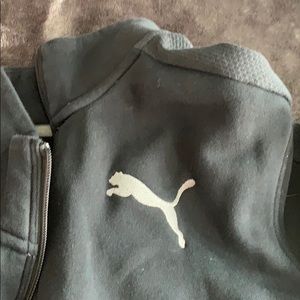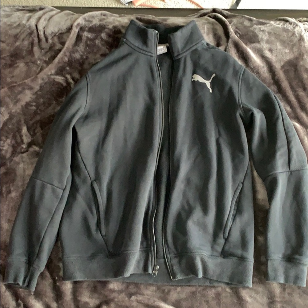 All black - picture makes it look somewhat gray but it is a solid black jacket. Lightly used, very soft fleece on the inside.