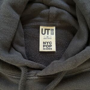 A Jean Michel Basquait x UNIQLO Hoodie, a must-have for any fashion-forward individual. This black hoodie features a high neck with a drawstring closure, long sleeves, and a hooded design. It is made of comfortable cotton jersey fabric and is adorned with a graphic print logo accent. Perfect for any season, this unisex hoodie is suitable for various activities such as walking, cross-training, and skateboarding. Its versatile style makes it appropriate for different occasions, whether you're going for a hipster, art, bohemian, outdoor, 80s, city, classic, or retro look. The hoodie is machine washable and is available in size XS.