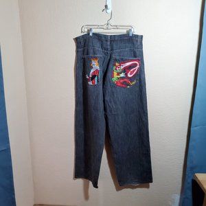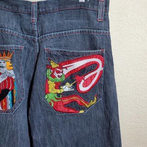 Jeans tagged 36x32 but flat lay measures 38 waist. Some fraying at seam by heel of foot. Embroidery looks good Kings and Joker.