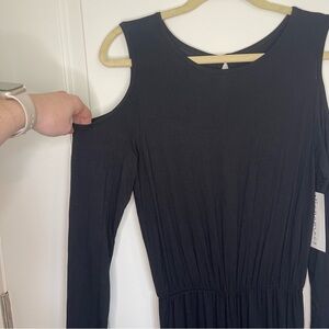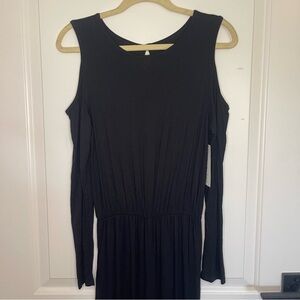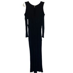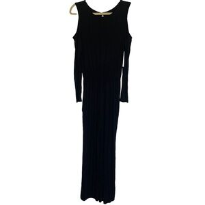 Women’s boutique brand Long-sleeve Black Jumpsuit w/cold shoulder, keyhole back cutout, elastic waistband, and pockets.