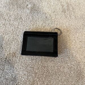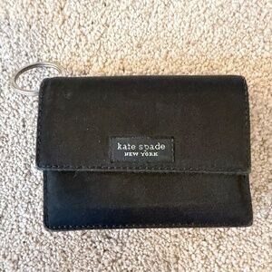 Pre-owned Black Kate spade messenger bag with matching wallet.12 in by 10 in by 4 inch. Velcro closure for bag with outside pocket. Wallet has snap closure with zipper pocket inside and key ring. Clear part on outside for ID. Price for both.