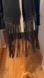 This beautiful new black cardigan has full leather trim around the sleeves, the collar and down the front of the sweater. Sweater is Tunic length with fringe that comes down to the knees of a 5 feet 5 inch frame. Made from viscose and polyester. Size extra large (size 16/18). Recommended dry clean only.