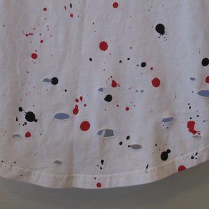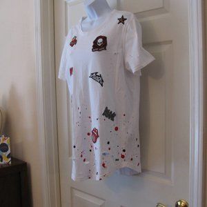 Black Kaviar tshirt top unisex size medium. Excellent condition, no wear or stains. White tee with patches and black and red ink spots. Destroyed distress style, rounded bottom hem. Material tag cannot be read due to colors, likely a cotton blend.