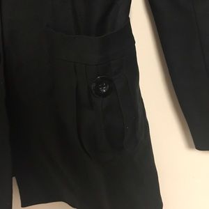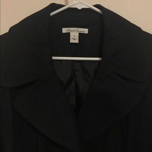 This trench coat features a wide lapel, deep pleated pockets and hits at the perfect thigh length. Belt is missing, has never been an issue for me.