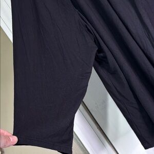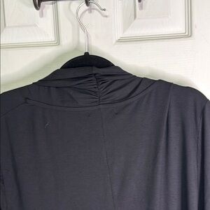 This black cardigan features a lightweight knit material and an open front design, offering a relaxed and flowing fit. Its versatile style makes it perfect for layering or wearing as a standalone piece.