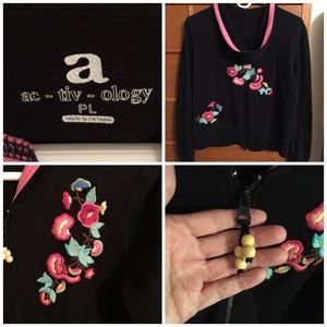 Embroidered floral details on front/back of zip-up jacket and front of pants. Pants have 2" wide elastic waist in addition to functional drawstring. Faux wooden beads accent drawstring & zipper pull. Worn twice. Measures: jacket : 22" chest, 23" length. Pants : 19" waist, 37" length.