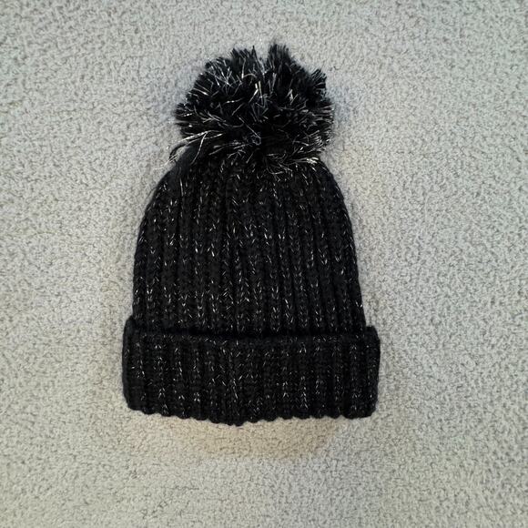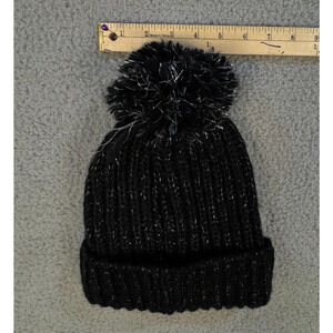 Black Knit Pom Pom Beanie Hat Silver Metallic Thread Womens One Size