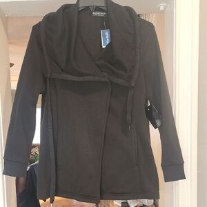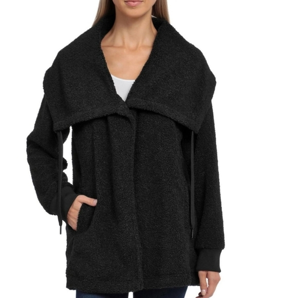 Stylish black knit wrap jacket by Bagatelle Collection. Features a cozy design with a draped wide collar and snap button closure.