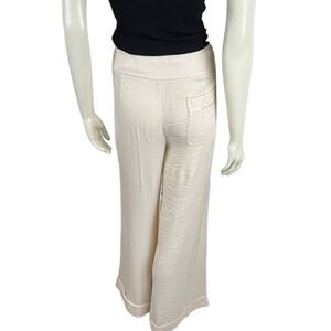 Perfect for holiday parties, these beautiful shimmering ivory wide leg pants by BCBG Max Azaria (black label) have an easy fit and feature a wide waistband (3") with triple hook/zip closure, hip slip pockets, one double rear pocket (pocket on a pocket), and wide cuffs at the bottom (2.5"). They are partially lined, and are 79% rayon and 21% polymide. The size 10 measures as follows: