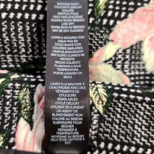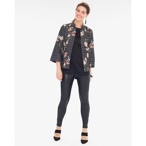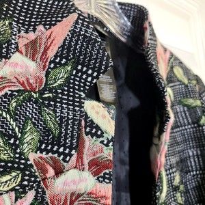 Style: Open Front with Hook / Eye Closure at Top, Black Label Floral Menswear Jacket (Chico's name for it), Lined, Dressy, Career, Boxy, 3/4 Sleeve, Bird