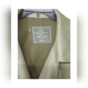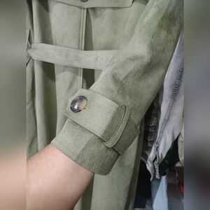 This elegant trench coat by Black Label showcases a sophisticated green hue, complete with shoulder epaulettes and a belted waist for a refined silhouette. Its timeless design ensures versatility and style for any occasion.