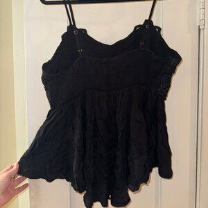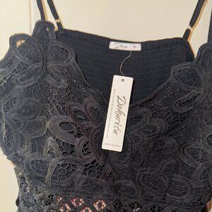 Dokuritu (Amazon) - Smocked Back V-Neck Spaghetti Strap Ruffle Hem Peplum Lace Camisole (Size XL). NWT. 100% Viscose. This black lace peplum top is a great elevated summery staple that can be dressed up or down, or worn with a cute cardigan when it's cooler. It features open pattern lace across the waist (can see skin through it), but the bust is lined. Featuring adjustable spaghetti straps, a smocked back, and a slight high-low peplum waistline, it is flowy and feminine, with a hint of sexy.