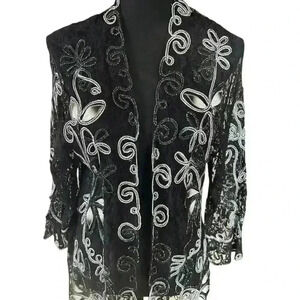 Black Lace Cardigan w/ Rope Floral Accents, size Medium.  Great used condition. There are no tags whatsoever so the size is based on the following measurements: