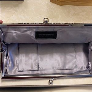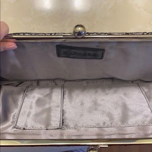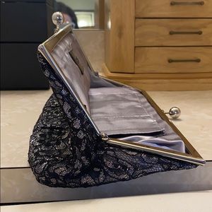 Black and silver lace clutch with light gray underlay from Express. Snap closure, two inner pockets to hold cash and credit cards. Gray satin on the inside. Measurements are approximately 13”(L) x 6”(H).