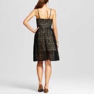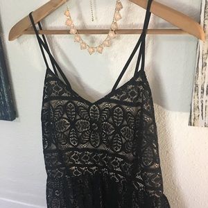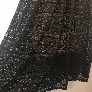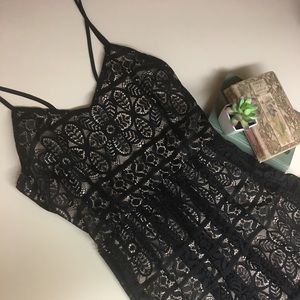 Gorgeous Black Lace Dress with Nude Underlay- beautiful front strap details in the front, and adjustable back strap feature to adjust to your perfect fit- Nude Underlay ends approximately 9" before the black lace bottom showing off some leg, but not to much- Length is approximately 42"- Perfect to dress up or down for any occasion!(dress only other items for styling)