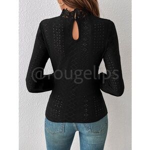 Black Lace Guipure Eyelet Mock Neck Long Sleeve Tee Shirt