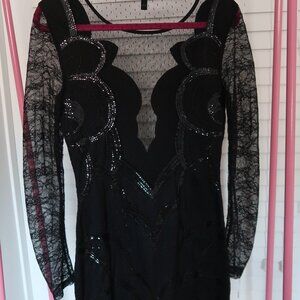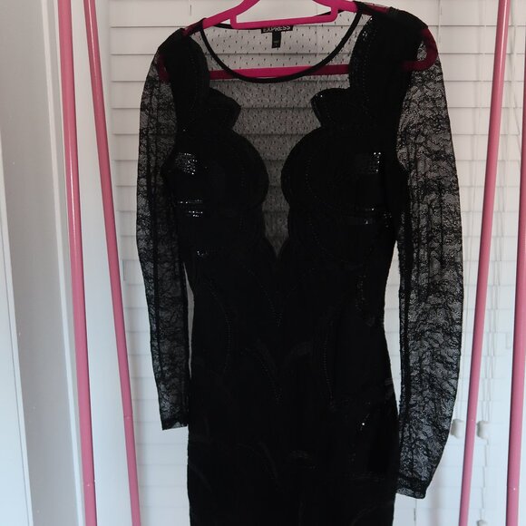 Turn heads at your next cocktail party or special event in this stunning Express long-sleeve black lace dress. Beautifully detailed with delicate lace and sparkling jeweled accents, this fitted silhouette flatters your curves while keeping it classy and sophisticated.