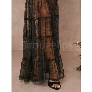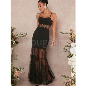 Black Lace Maxi Dress Sheer Details Flared Mermaid Skirt