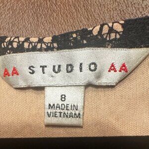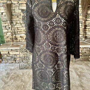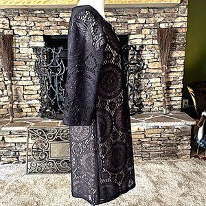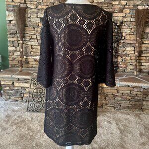 Charming black lace overlay dress with ¾ sleeves and a stunning gold accent! Size 8, it's ideal for dancing, dining, and unforgettable occasions! AA Designer Size 8