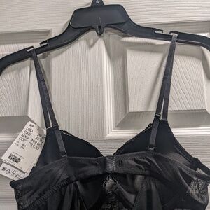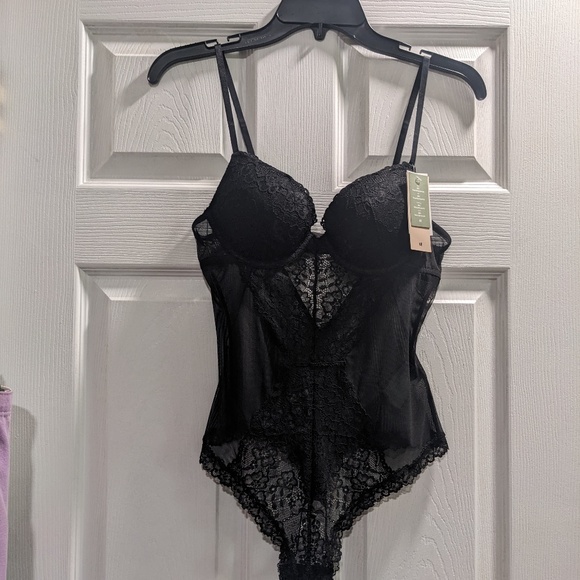 Thong bodysuit in lace with push-up bra. Adjustable shoulder straps, padded, underwire cups to maximize bust and cleavage, and lined gusset with concealed snap fasteners. This is brand new with tags.