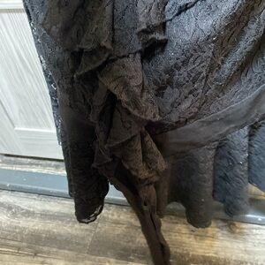 Elegant black lace jacket with ruffled details. Perfect for a stylish look.