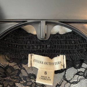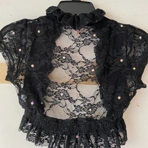My daughter wore this for dance..see pic. Cute little “jacket” that covers the shoulder and upper back. Made by Zenna Outfitters and is size Small. Model is my daughter who is 5’2” 105lbs. and a 32A. No rips or tears. In great condition. Rhinestones were added for extra sparkle.