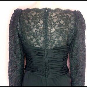 If it were longer it would be SO early 50s! Incredibly well-made by high-end formal dress distributor, Victoria Royal. Lots of boning at bodice, off shoulder treatment makes neckline stand out PAST shoulders, held in place with inside straps (one photo shows armholes, boning and straps). Sheer lined lace yoke is Alencon lace that goes to graceful long raglan sleeves and enhances a sweetheart neckline. From the high waist to hem, it's Rayon crepe, AMAZING draped ruching and layering at bust and waist, coming to a sarong look skirt. All this and trimmed with its own sewn on rhinestone brooch. Waist & skirt fully lined. Flawless & clean.