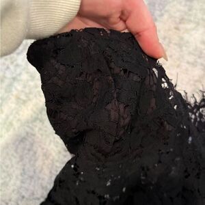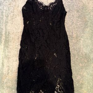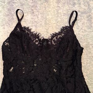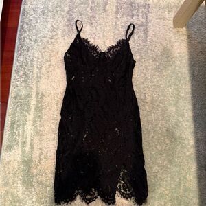 Elegant black lace dress from shein in a size medium. Features spaghetti straps and a small leg slit. Perfect for evening wear. Message for any questions 😊