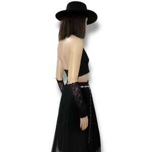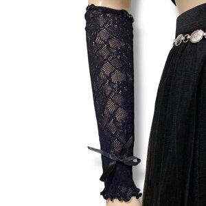 black lace arm warmers, textured fabric, elbow-length gloves, fingerless gloves, adjustable fit.