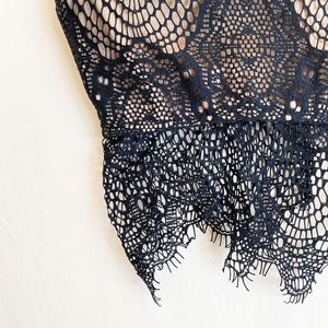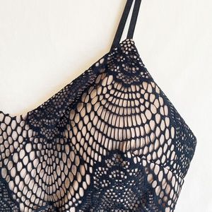 A Black Delicate Lace Bralette featuring Tonal Lining, Spaghetti Straps, Built In Cups, Low Cut V Neckline, Scallop Lace Trim on Hem and Back Zipper.