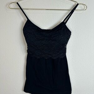 Black Lace Trim Camisole Top Adjustable Straps Stretchy Ribbed Tank One Size