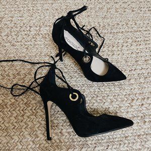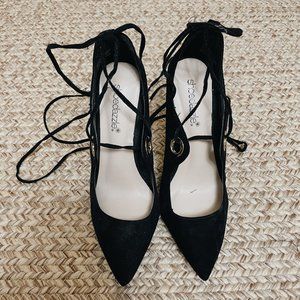Black suede lace-up pointy heels. There is a little bit of fraying on the strings. Worn a few times, in great condition.