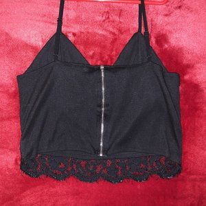 Large black tank top with laced front, zipper in the back, and adjustable straps