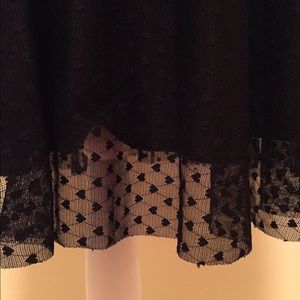 Super sweet black lacy dress with cross-cross back straps. Lace design has tiny hearts. Flattering ruched/gathered bodice with a flowy skirt. Sheer lace over lining; slightly stretchy.