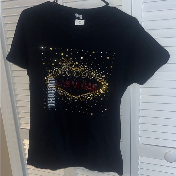 Stylish black t-shirt with a vibrant Las Vegas graphic. Features gold and red accents.