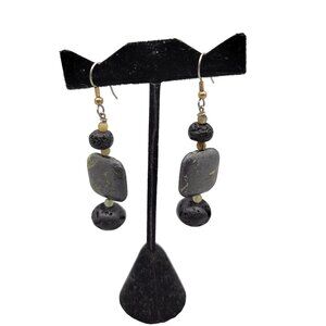Black Lava rock and green tree agate dangle earrings with fish hook closure. The dark green stones are flat square shaped and have pale yellow streaks through them.