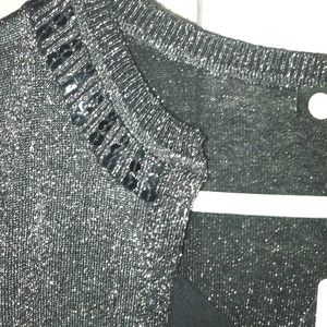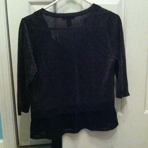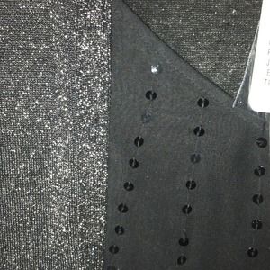 This is a black sequined top attached to a shimmery gunmetal cardigan. It has 3/4 length sleeves and is a silk/viscose/poly blend. The cardigan portion is shorter than the black sequined top underneath, but it is attached. It is a size medium.
