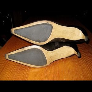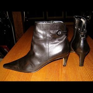 AK ankle boots with silver and lacing detail at back of ankle. 2.5 in heel. Elegant yet comfortable. Gently worn, expertly cared for.