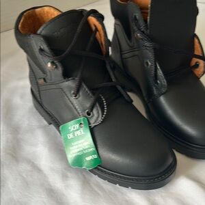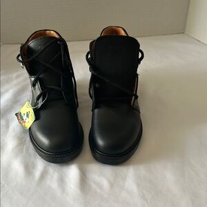 These black leather ankle boots feature a classic design with black laces and metal eyelets. Made from smooth leather, they have a rounded toe and a durable sole, perfect for casual or work settings.